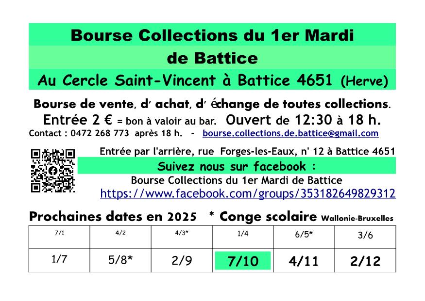 Bourse de toutes collections de vente, d'achat, d'échange entre particuliers, amateurs, collectionneurs et/ou pros.Vous trouverez : cartes postales anciennes, timbres, monnaies, billets de banque, billets souvenir 0 €, capsules de Champagne, cartes Pokémon Panini, pierres, chromos, ...