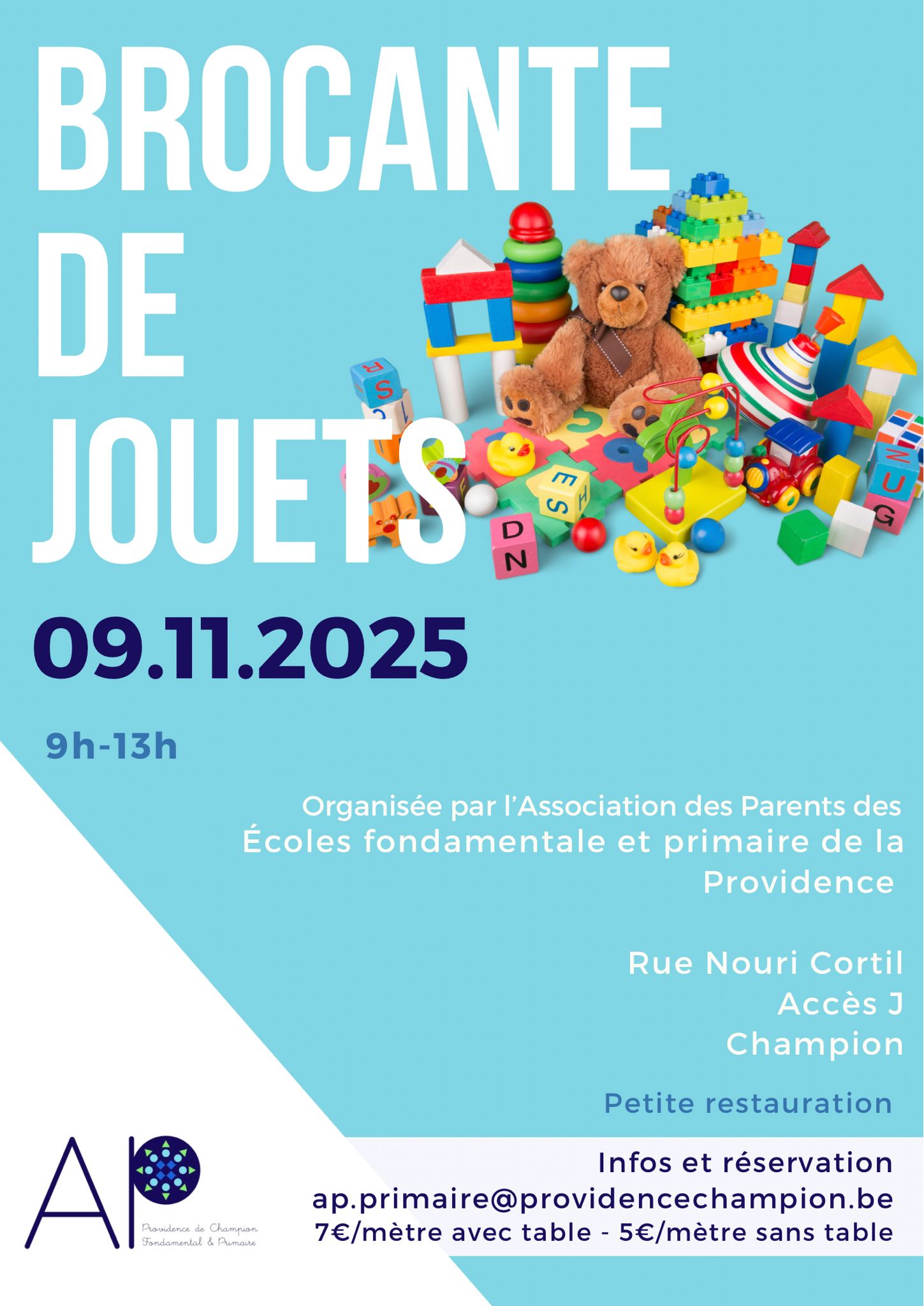 Ce dimanche 9 novembre 2025, l’association des parents des écoles fondamentale et primaire de la Providence de Champion organise une super bourse aux jouets et vous invite à venir y faire un tour ou à y exposer vos plus beaux articles.Des centaines de bonnes affaires vous y attendent! Pour votre plus grand confort, la salle sera chauffée.