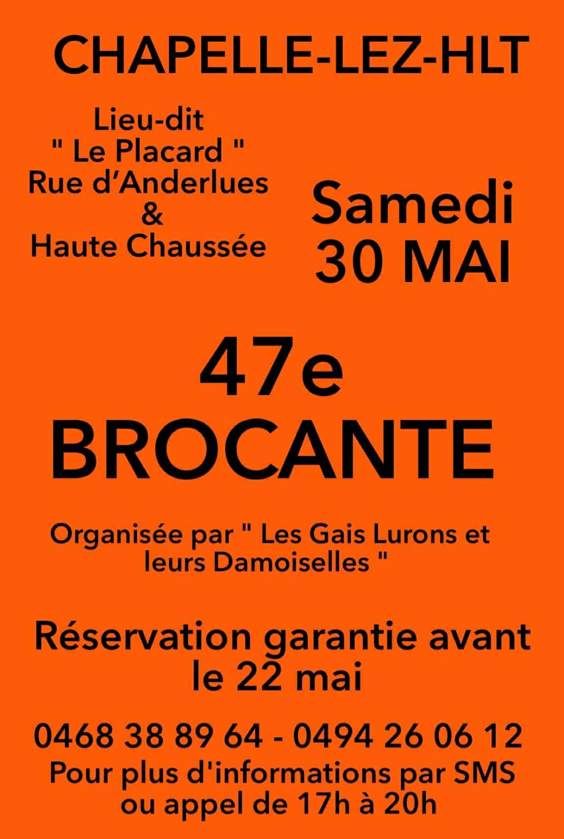 Ne manquez pas l’événement incontournable du printemps à Chapelle-lez-Herlaimont.La 47e BROCANTE vous donne rendez-vous le samedi 30 mai au lieu-dit « Le Placard », Rue d’Anderlues et Haute Chaussée.