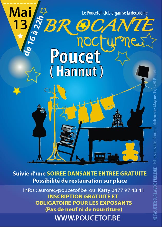 Pour la deuxième fois nous vous attendons nombreux à la brocante nocturne de Poucet, plus d'1km d'objets à chiner dans une ambiance familiale et bon enfant. Petite restauration sur place et soirée...Informations pratiques