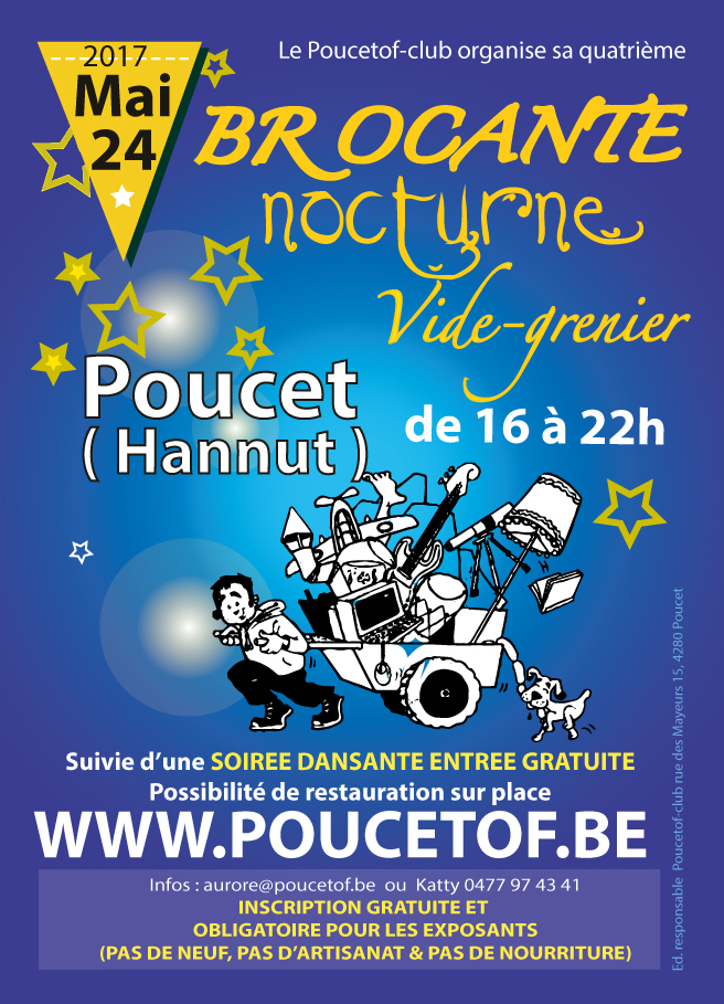 Le Poucetof-club vous invite à sa brocante nocturne dans le cadre des festivités de l'Ascension ! 1,5 km de bonnes affaires vous attendent. Petite restauration sur place. Venez nombreux !Informations pratiques