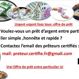 Vrai prêteur : offre de prêt entre particulier certifié : pour vos demandes de prêt de 1000€ à 100 000 000€ , contactez : mail : preteur.certifie.fr@gmail.com , bonjour à tous 1. Paris 2. Marseille