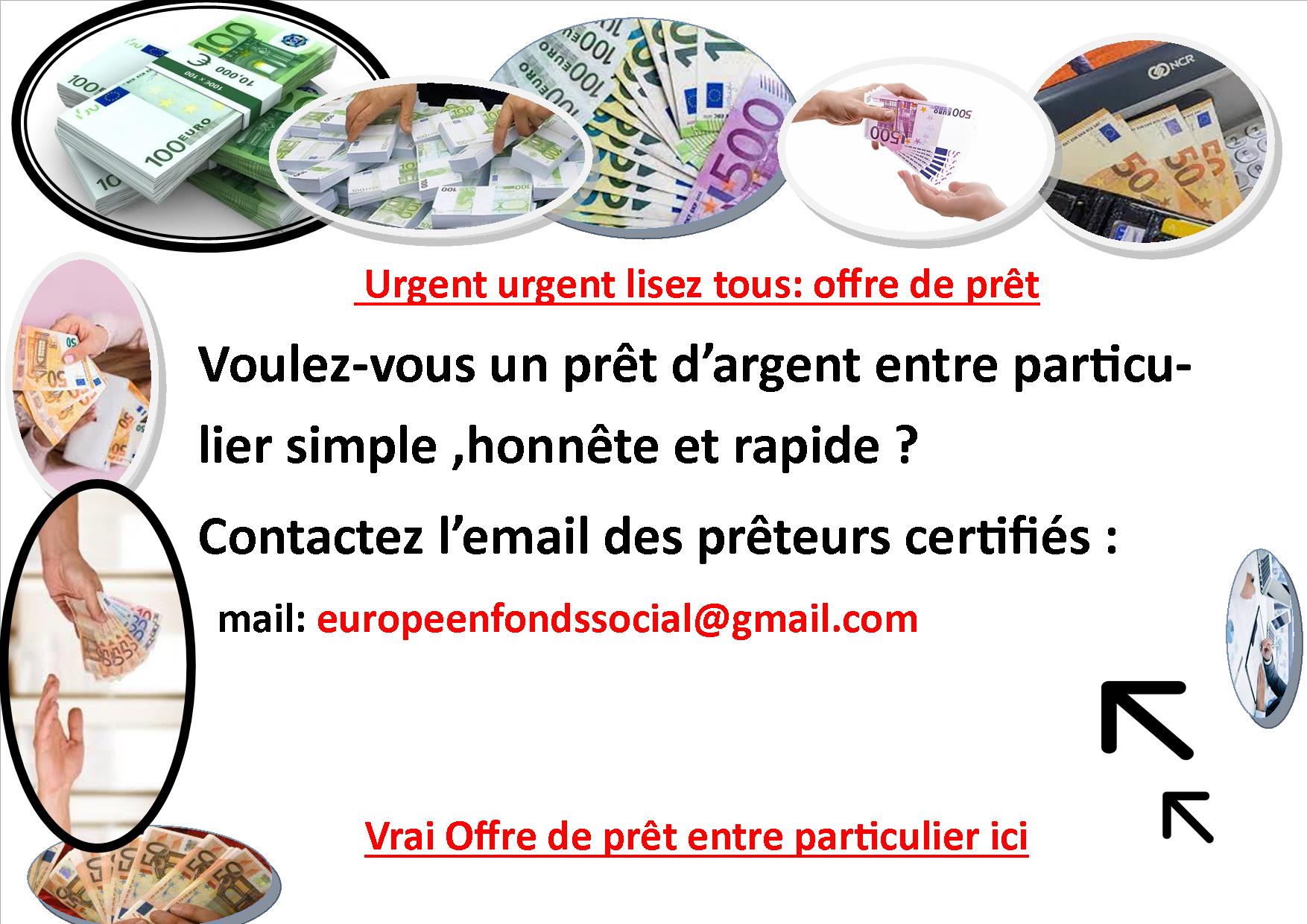 Vrai prêteur : offre de prêt entre particulier certifié : pour vos demandes de prêt de 1000€ à 100 000 000€ , contactez : mail : preteur.certifie.fr@gmail.com , bonjour à tous 1. Paris 2. Marseille
