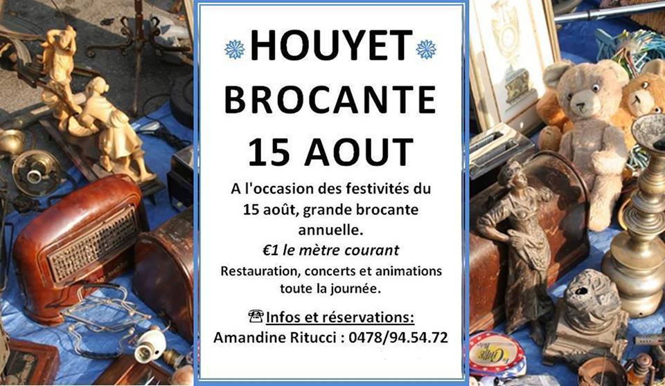 A l'occasion des festivités du 15 août, le comité des jeunes des villages houyetois (AJVH) organise une brocante, accompagnée de concerts, d'animations et de repas.1€ le mètre courant, arrivée à partir de 06h, emplacement libre sur la rue principale du village. Nombre d'exposants : environ 60. Renseignements au 0478/94.54.72.