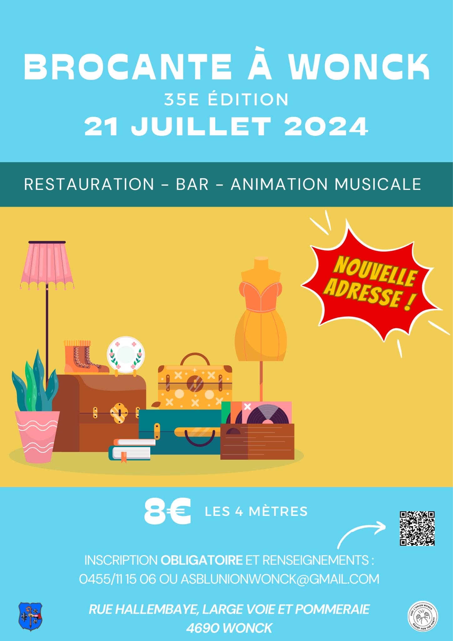 Bonjour à tous,Pour sa 35e édition, nous avons pris la décision de délocaliser la brocante de l’autre côté du village. Elle démarrera de la rue d’Hallembaye, passera par la rue Large Voie et se terminera rue Pommeraie. Pourquoi ? - Réduire le parcours car la fréquentation était en baisse par rapport aux glorieuses années que cette brocante a connu. - Mettre en avant les comités wonckois en les plaçant au cœur de la brocante et en profitant d’une infrastructure commune. - Rendre plus agréable la visite en bénéficiant d’une rue plus large. Le prix quant à lui reste inchangé ! 8€/4metres (les voitures, camionnettes ou remorques doivent être garées en dehors du parcours ou sur un emplacement payant). Les réservations se font par téléphone au 0455 11 15 06 ou par e-mail à l’adresse asblunionwonck@gmail.com À communiquer lors de votre réservation : - Nom - prénom - numéro de téléphone - Nombre d’emplacements souhaités (par 4 mètres) Nous nous réjouissons d’y être ! Le comité organisateur