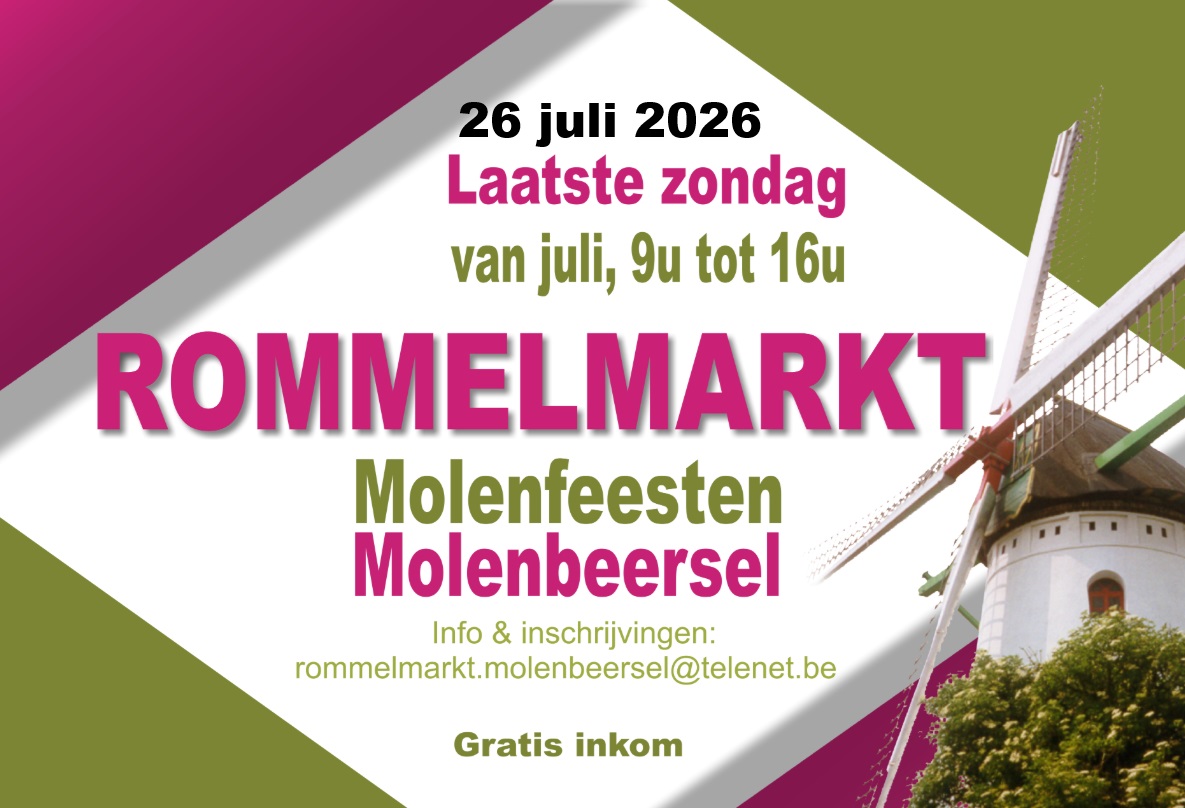 Gezellige Rommelmarkt tijdens de Molenfeesten Molenbeersel.We houden dit jaar onze 42 ste Molenfeesten 24 - 25 - 26 juli 2026.
